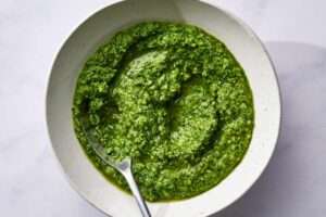 Blend roasted pumpkin seeds with fresh basil, garlic, lemon juice, Parmesan cheese, and olive oil.