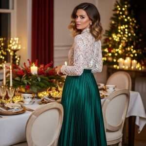 A midi skirt paired with a beautiful blouse brings a classic yet sophisticated Christmas dinner look.