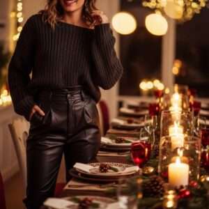 For a trendy yet warm Christmas dinner outfit, faux leather pants are a chic alternative to jeans.