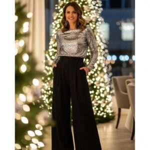 Amazon Suggestion: Women’s Sequin Long Sleeve Top + High-Waisted Wide-Leg Dress Pants.