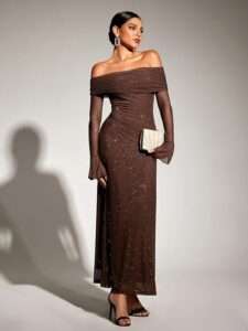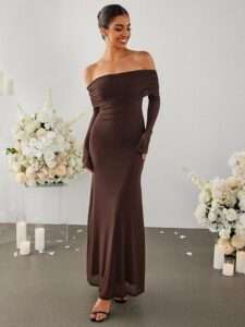 This stunning off-the-shoulder bodycon maxi dress is a perfect pick for a Christmas wedding, offering both warmth and sophistication with its long sleeves and flattering ruched design.