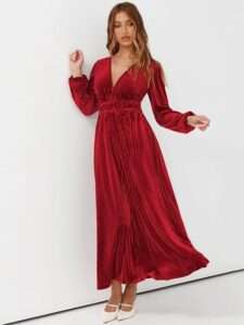 Available in rich holiday tones like burgundy, green, and navy blue, this dress ensures you’ll shine with confidence and glamour throughout the event.