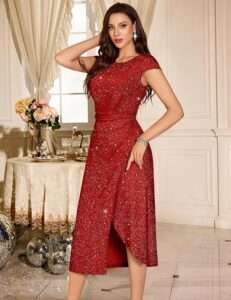 With its side slit, high waist design, and variety of rich colors like red, green, and champagne, this dress ensures you’ll look stunning and confident at any winter wedding or holiday event.
