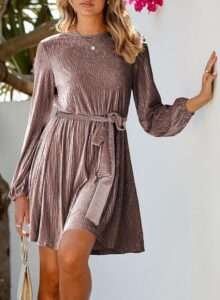 With its waist belt and lantern sleeves adding a chic touch, this dress pairs beautifully with heels and jewelry for a festive, sophisticated holiday celebration.