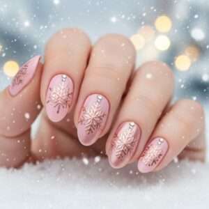 Combine the beauty of pink nails with delicate rose gold snowflakes.