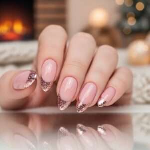 A timeless look that blends soft pink polish with shimmering rose gold glitter on the tips.