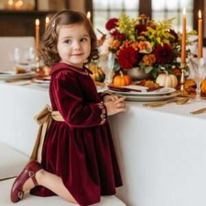 Velvet dresses in deep green, burgundy, or navy with gold detailing bring elegance to a toddler’s Thanksgiving wardrobe.