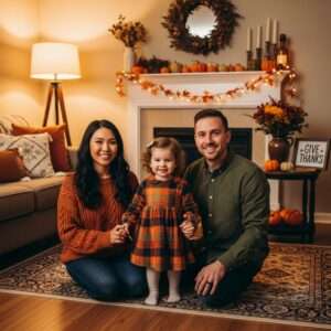 You can add a small knit hat in coordinating colors for extra warmth and style. This outfit is perfect for family gatherings or casual Thanksgiving outings.