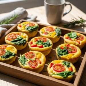 Bake mini frittatas in muffin tins with colorful vegetables like bell peppers, spinach, and tomatoes.