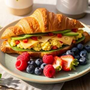 A buttery croissant filled with eggs, cheese, and vegetables, plated with fresh berries or greens.