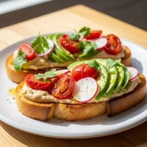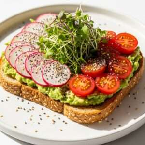 Spread mashed avocado on toast and arrange toppings creatively—think radish slices, cherry tomatoes, sprouts, or microgreens.