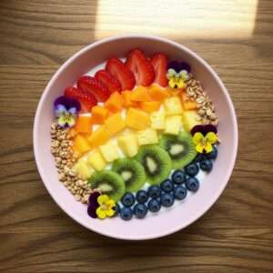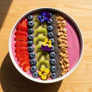 Top with sliced fruits, chia seeds, granola, and edible flowers.