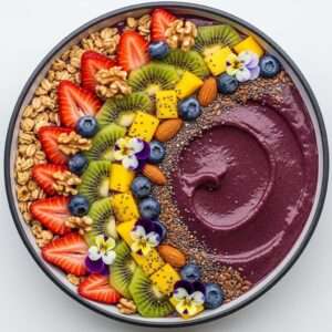 A deep purple acai base topped with sliced fruits, granola, nuts, seeds, and edible flowers.