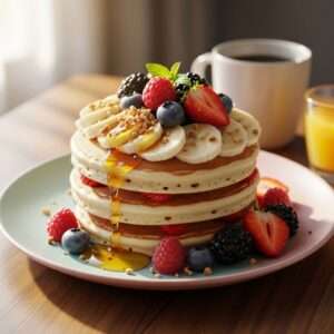 Stack pancakes and top with berries, banana slices, nuts, and a drizzle of honey or syrup.