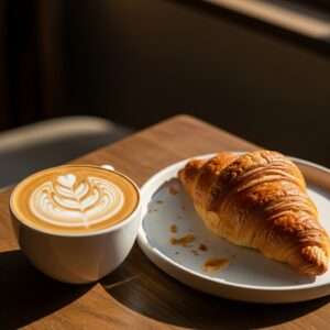 Pair a beautifully crafted latte with foam art alongside a fresh pastry like a croissant or Danish.