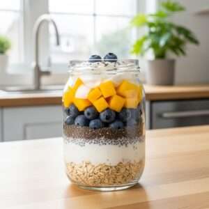 Use contrasting colors like blueberries and mango for a visually striking breakfast.