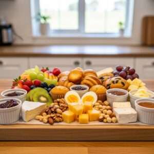 Arrange small portions of fruits, pastries, cheese, nuts, boiled eggs, and spreads on a large wooden board.