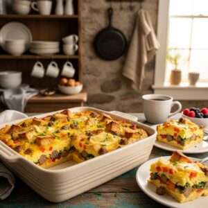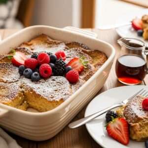 A French toast casserole layered with bread, eggs, milk, and cinnamon is ideal for a crowd.
