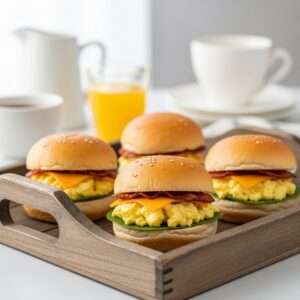 Prepare mini breakfast sandwiches using English muffins, scrambled eggs, cheese, and bacon or sausage.
