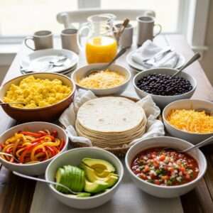 Scrambled eggs, beans, cheese, and sautéed veggies can be placed in bowls for a DIY breakfast burrito bar.