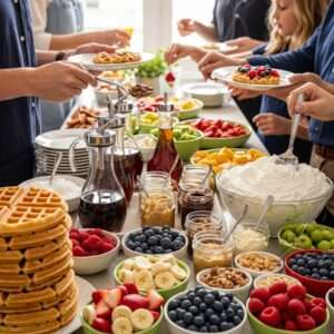 Set up a waffle bar with pre-made waffles, fruits, nut butters, syrups, and whipped cream.
