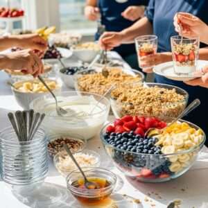 Guests can create their own parfaits, making it a visually appealing, healthy, and easy option for large gatherings.