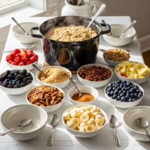 Cook a large pot of oatmeal and provide toppings like brown sugar, nuts, fruits, chocolate chips, and cinnamon.
