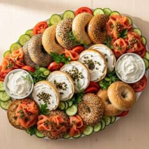 For a no-cook option, assemble a bagel platter with cream cheese, smoked salmon, sliced tomatoes, cucumbers, and capers.