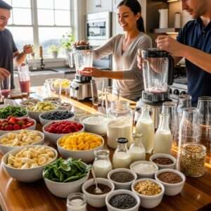 Set up a smoothie station with various fruits, yogurt, milk, and add-ins like protein powder or spinach.