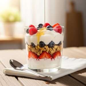 Layer Greek yogurt with granola, fresh berries, and a drizzle of honey in a glass or bowl.
