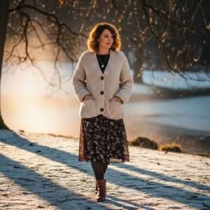 A knit cardigan layered over a floral skirt gives a soft, feminine winter look.
