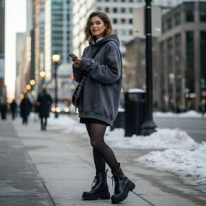 Add tights and combat boots for a trendy casual vibe that’s warm and stylish.