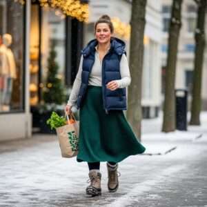 For a sporty winter vibe, pair a puffer vest with a knit skirt and fitted long-sleeve top.