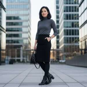 A classic knit turtleneck and pencil skirt combo creates a sleek winter outfit that’s casual yet refined.