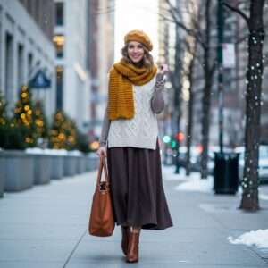 A chunky knit sweater paired with a wool skirt creates a warm and elegant winter look.