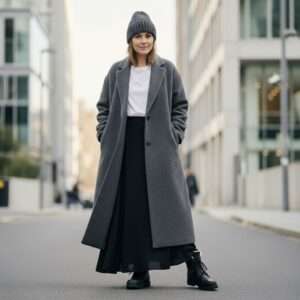 Add winter boots and a beanie for extra warmth. This style is minimalist yet chic.