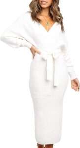This lightweight sweater dress is perfect for a Christmas dinner outfit because its premium knit fabric offers cloud-like softness and warmth while keeping you comfortable all day.
