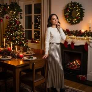 Pair it with a fitted knit top or classic blouse for an elegant, photogenic Christmas dinner outfit.