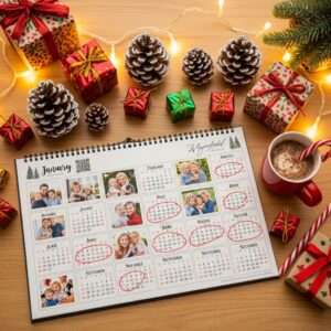 A personalized calendar featuring family photos or important dates adds a personal touch to her daily routine.