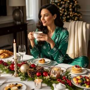 Why it works: You’re hosting, you want to feel presentable but comfy. Elevating pajamas gives you that “holiday getaway at home” vibe.