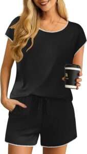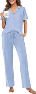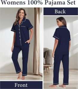 This ANLIQI women’s pajama set offers super soft and comfortable 100% cotton fabric that is breathable, moisture-wicking, and gentle on the skin for all-night coziness.