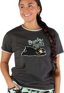 The classic pajama pants feature a plush-backed elastic waistband, drawstring, and pocket, while the cute bear tee with raw-edged trim adds playful charm.