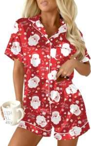 This women’s Christmas pajama set features a festive and fun design with reindeer, snowflakes, Santa, and Christmas trees, perfect for holiday photos or matching with loved ones.