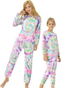 The trendy tie-dye swirl pattern in purple, pink, yellow, and green adds a fun, eye-catching style perfect for Pajama Day or a slumber party.