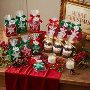 Give guests small gifts like ornament keepsakes, holiday cookies, scented candles, or mini hot chocolate kits.