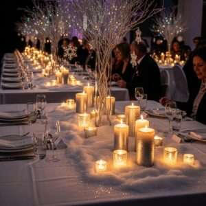 Consider artificial snow, glitter, or shimmer effects on tables, the dance floor, or around the cake.