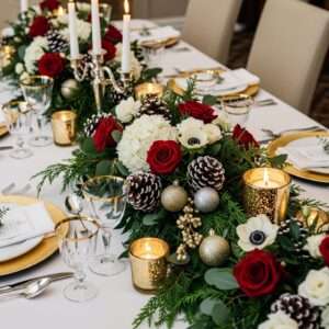 Mix red, white, and green flowers like roses, poinsettias, or amaryllis with candles, pinecones, and ornaments.