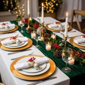 Add small seasonal touches like mini pinecones, holly sprigs, or ornament favors at each seat for a personal touch.