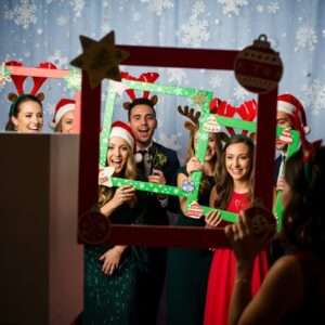 Set up a photo booth with seasonal props like Santa hats, reindeer antlers, snowflake backdrops, or festive frames.