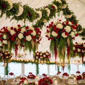 Use hanging floral arrangements, garlands over entryways, or dramatic centerpieces with winter flowers and greenery.